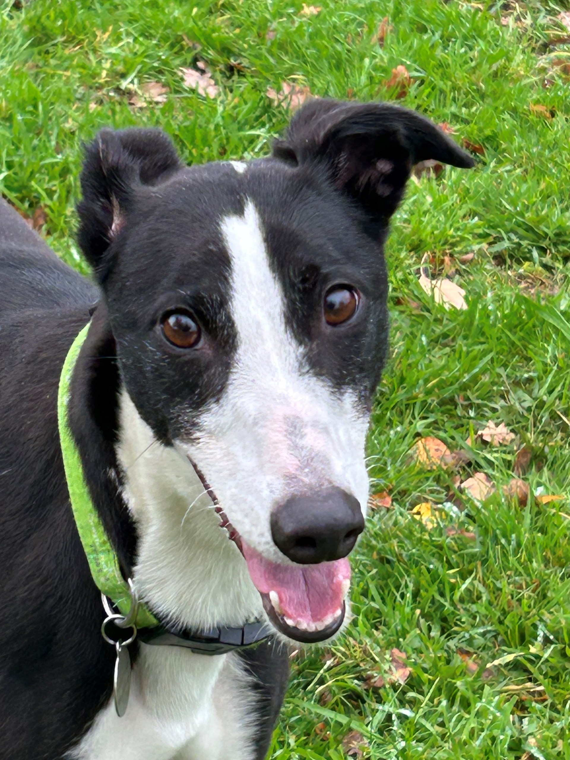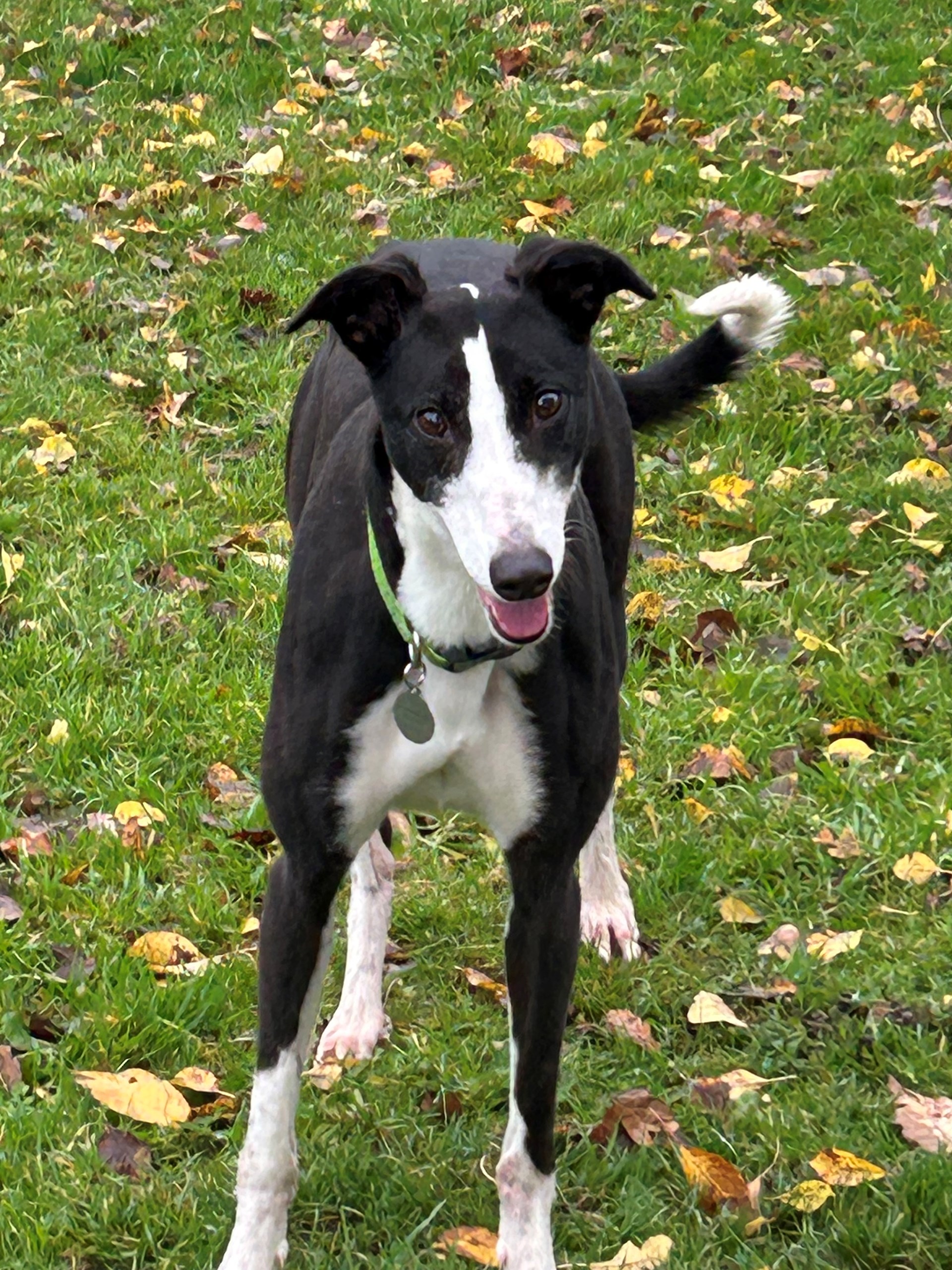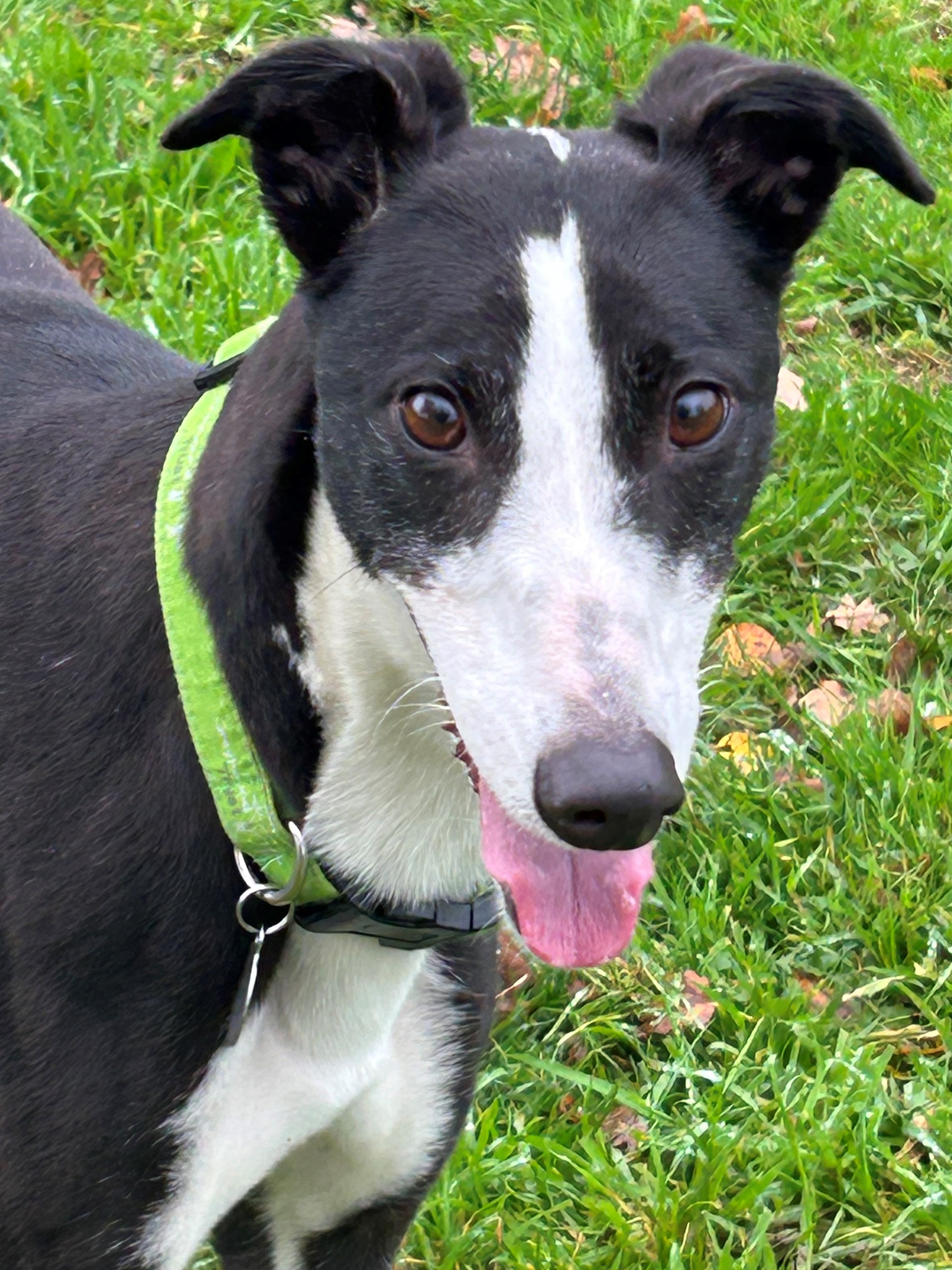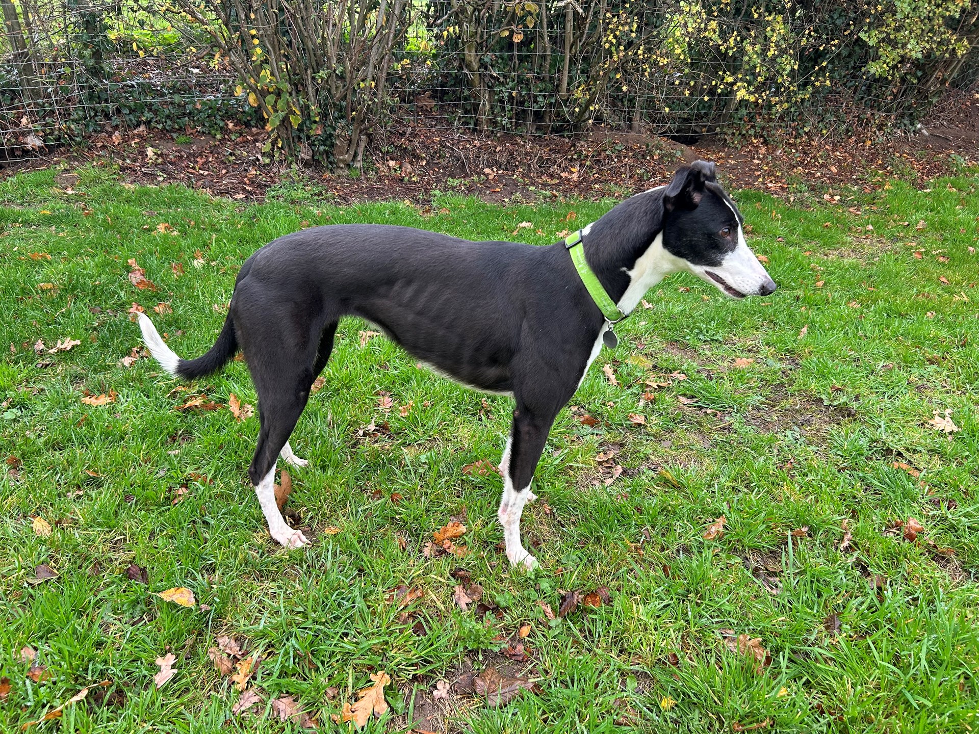 Emma is very pretty and quite small for a greyhound. She is English bred but has never raced and we are still trying to find her exact date of birth for you. She is fairly young though and very bouncy at home. She lives fuss and attention and bouncing around you in the paddock.