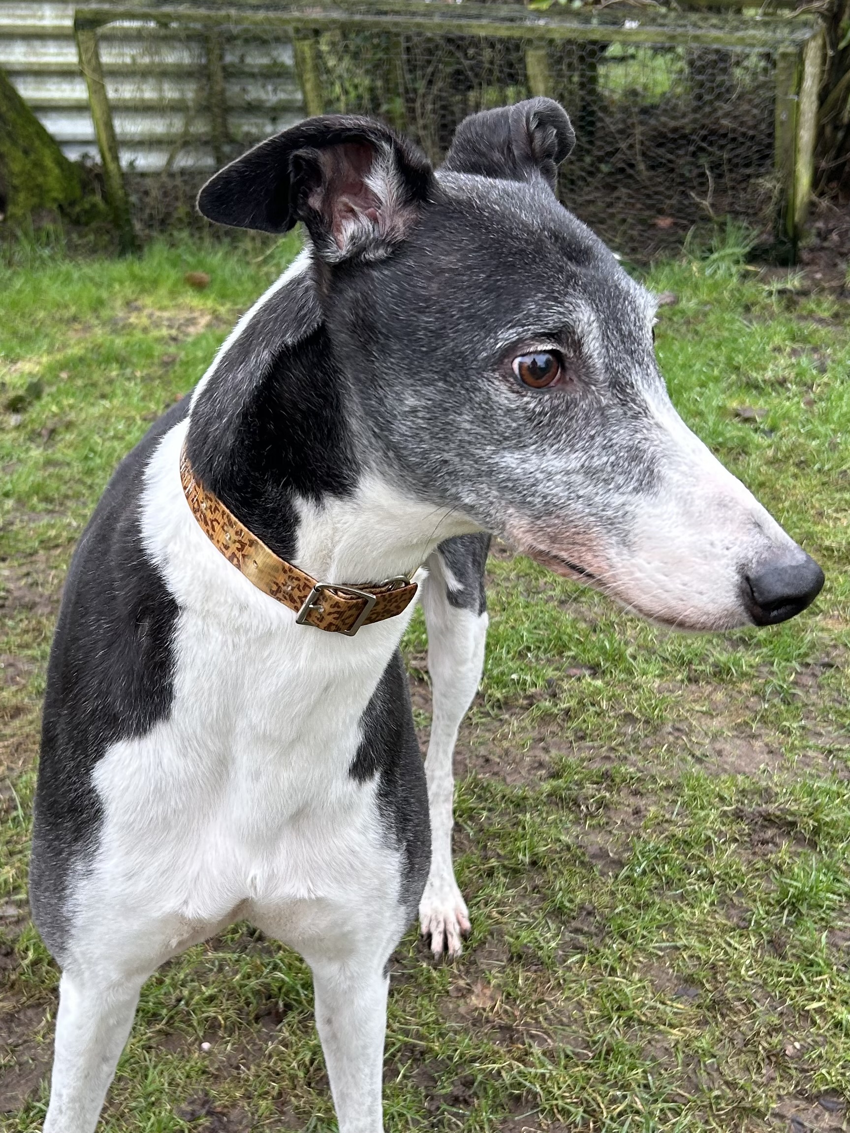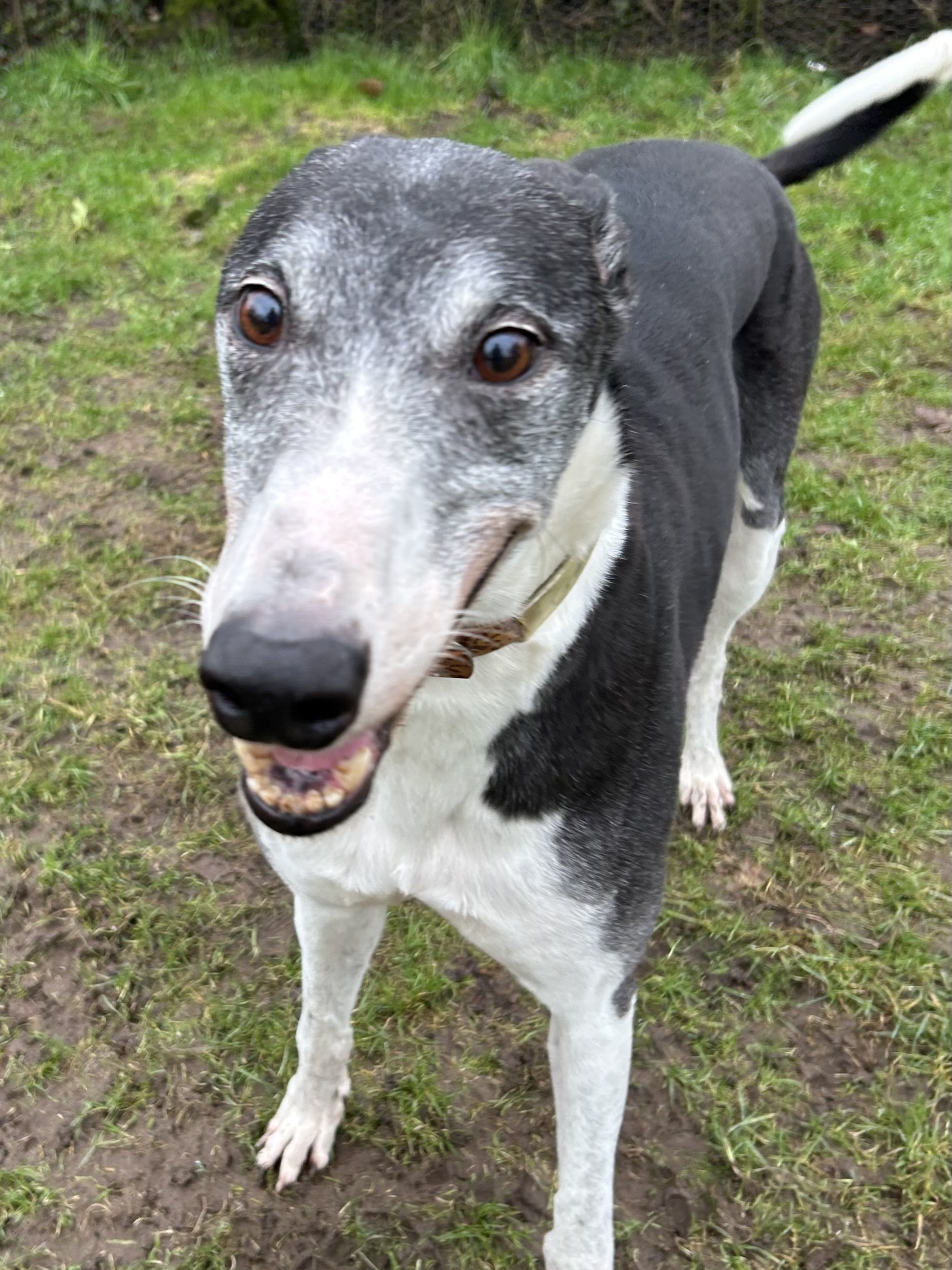 Meet Gent, racing name Aghaburren Gent, who is currently at our North Wales branch nr Abergele. Gent lives up to his name, he is a calm and chilled but friendly boy who is just looking for an easy life and a sofa to retire on. Gent is 7 1/2 years old (DOB 7/07/2018) and has spent all his life in kennels so far. He has been overlooked for re homing through no fault of his own and now really does deserve someone willing to let him experience the comforts of a new home. He would make an ideal companion for an older couple or a family dog with older children. He is friendly and enjoys a fuss and a lean on you. He walks nicely on the lead and has been happy to meet or ignore other breeds of dog which ever is required. He would be content as an only dog or possibly with an older female dog as a companion. He is happy to be left on his own as he enjoys snoozing after his walks. Gent is a typical laid back greyhound boy who just wants a quiet life where he can at last enjoy his retirement with some home comforts.